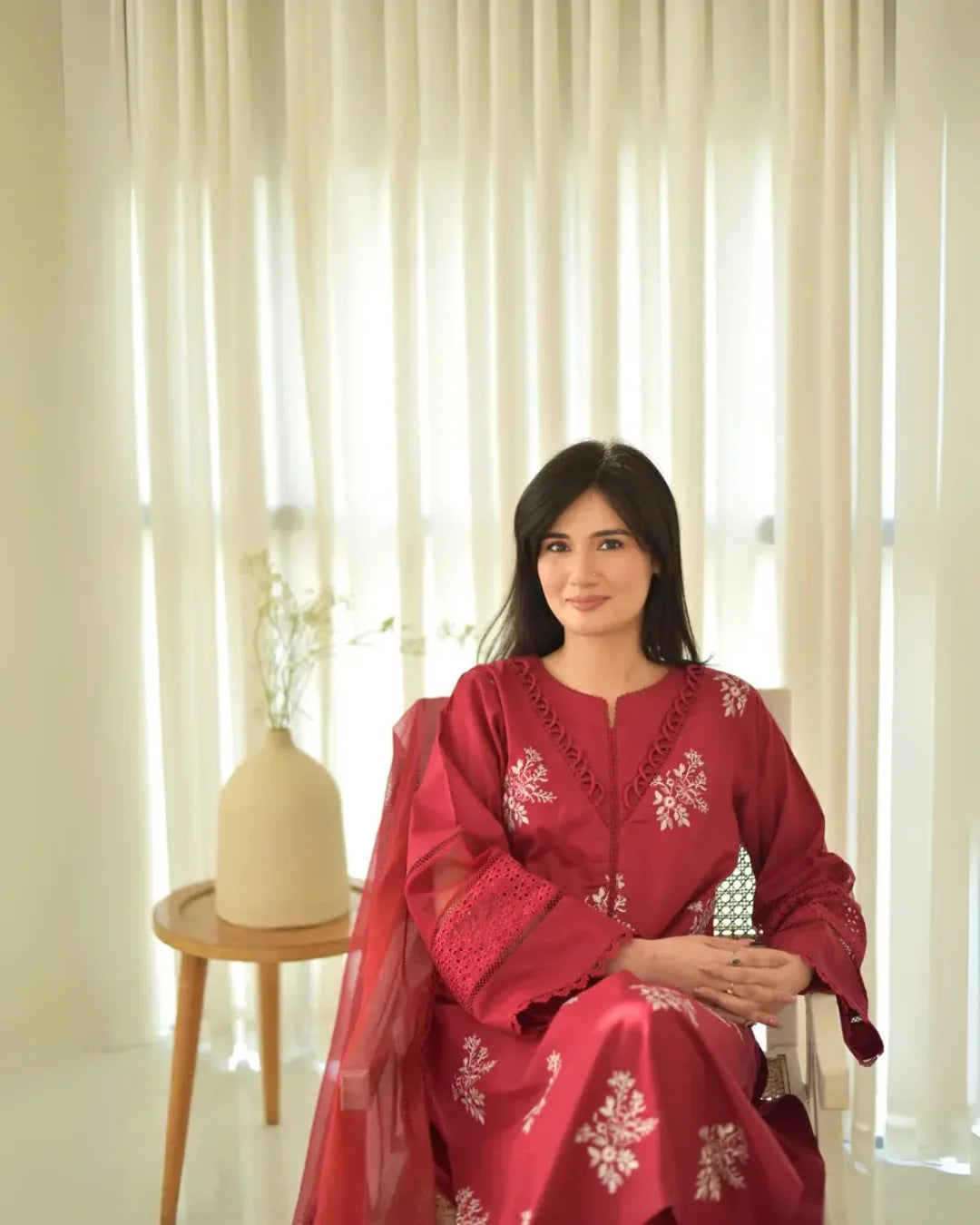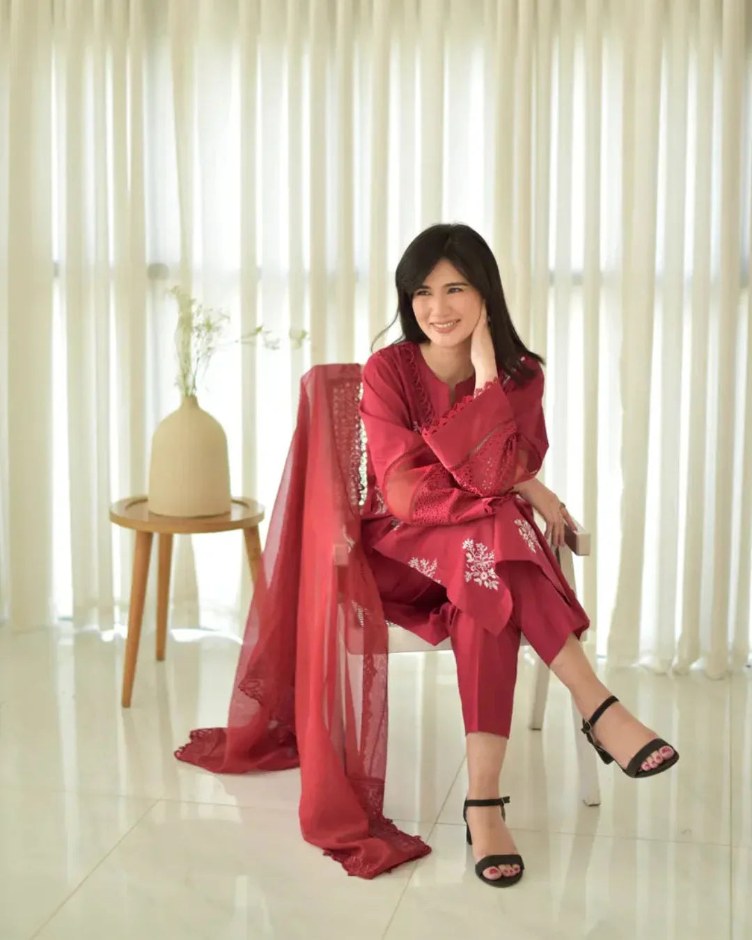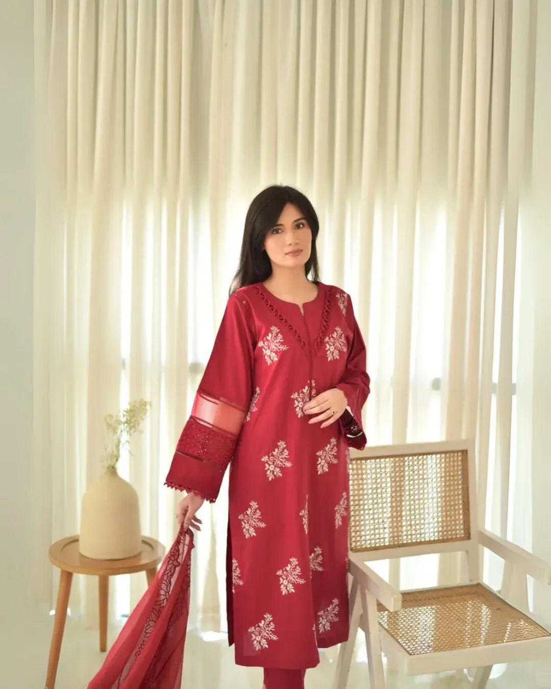 A timeless blend of elegance and charm, Merry Bliss in maroon is a statement of refined grace. Crafted from premium lawn fabric, this 3-piece outfit features delicate white floral embroidery that pops beautifully against the rich maroon base. The shirt is accented with lace inserts and cutwork details on the sleeves, creating a dreamy fusion of tradition and modern style. Paired with a dyed trouser and a matching embroidered dupatta, this outfit is perfect for both daytime gatherings and evening soirees.
