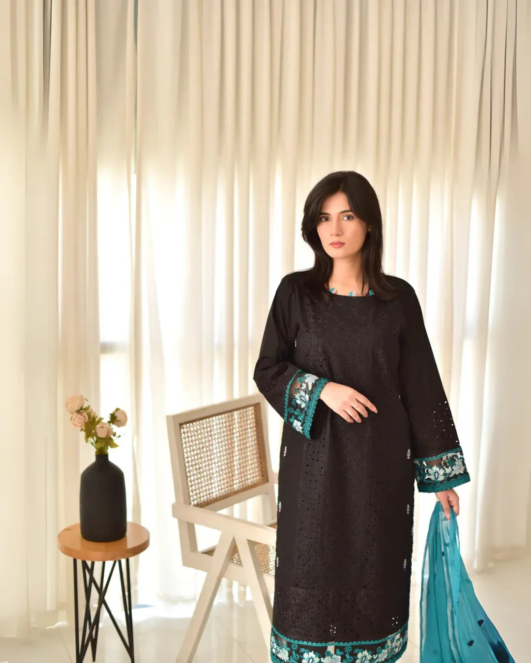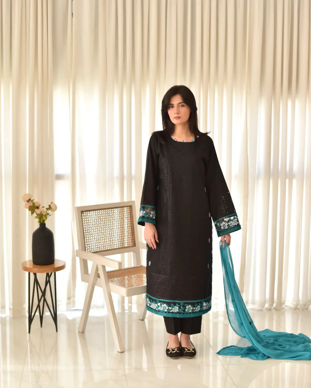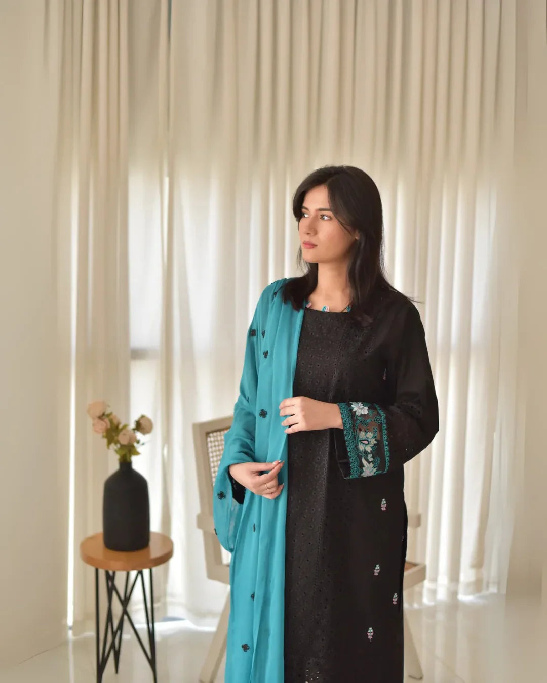 Embrace sophisticated elegance with the Midnight Bloom 3-Piece Dress, a striking ensemble designed for the woman who appreciates bold style and effortless grace. Crafted from premium fabric, this dress features exquisite embroidery and a comfortable, flowing silhouette, perfect for a variety of occasions. The deep black hue brings a touch of dramatic flair to your look, ideal for both evening events and special gatherings. Complete with a beautifully embellished turquoise dupatta, this outfit is sure to enhance your wardrobe with its understated beauty.