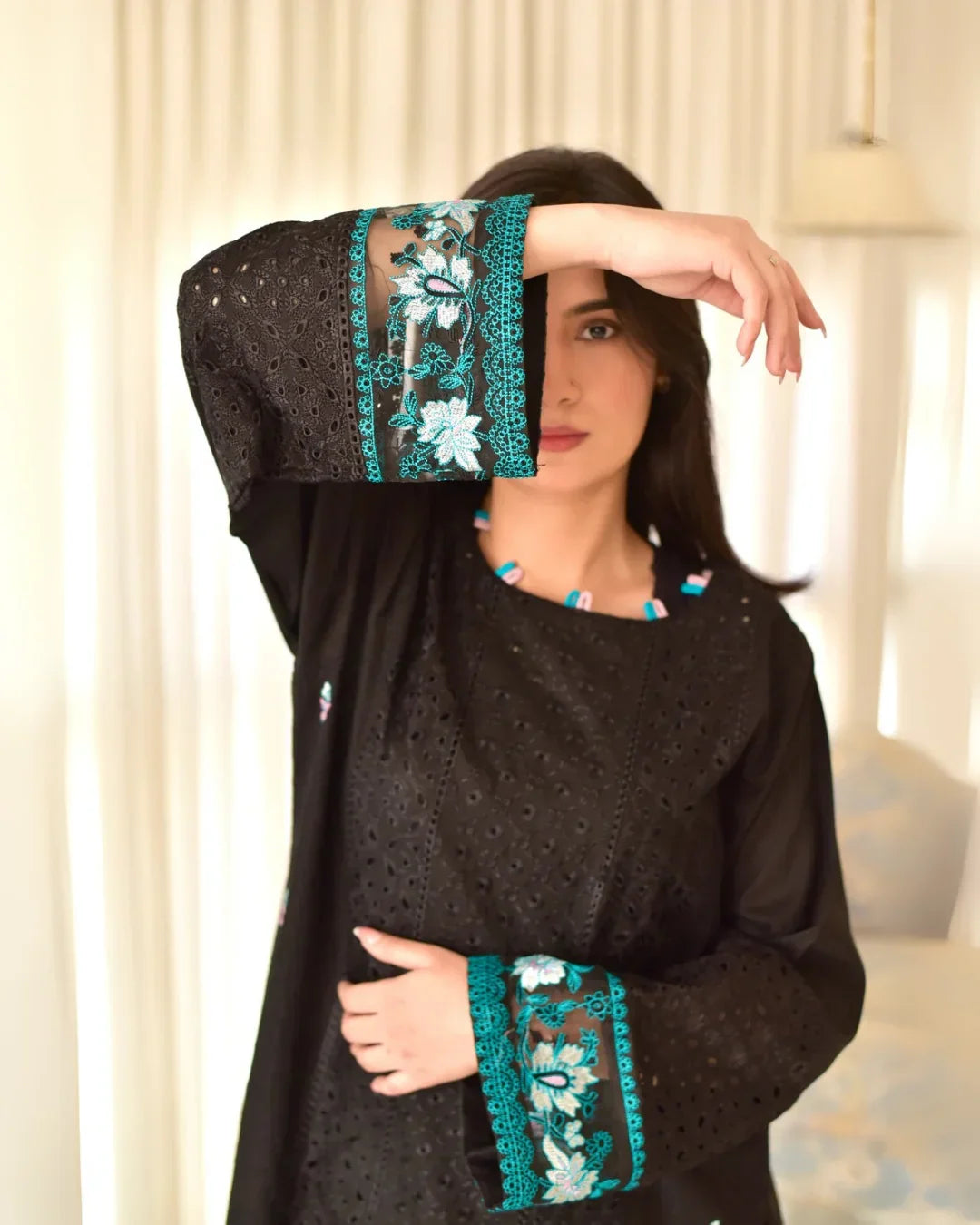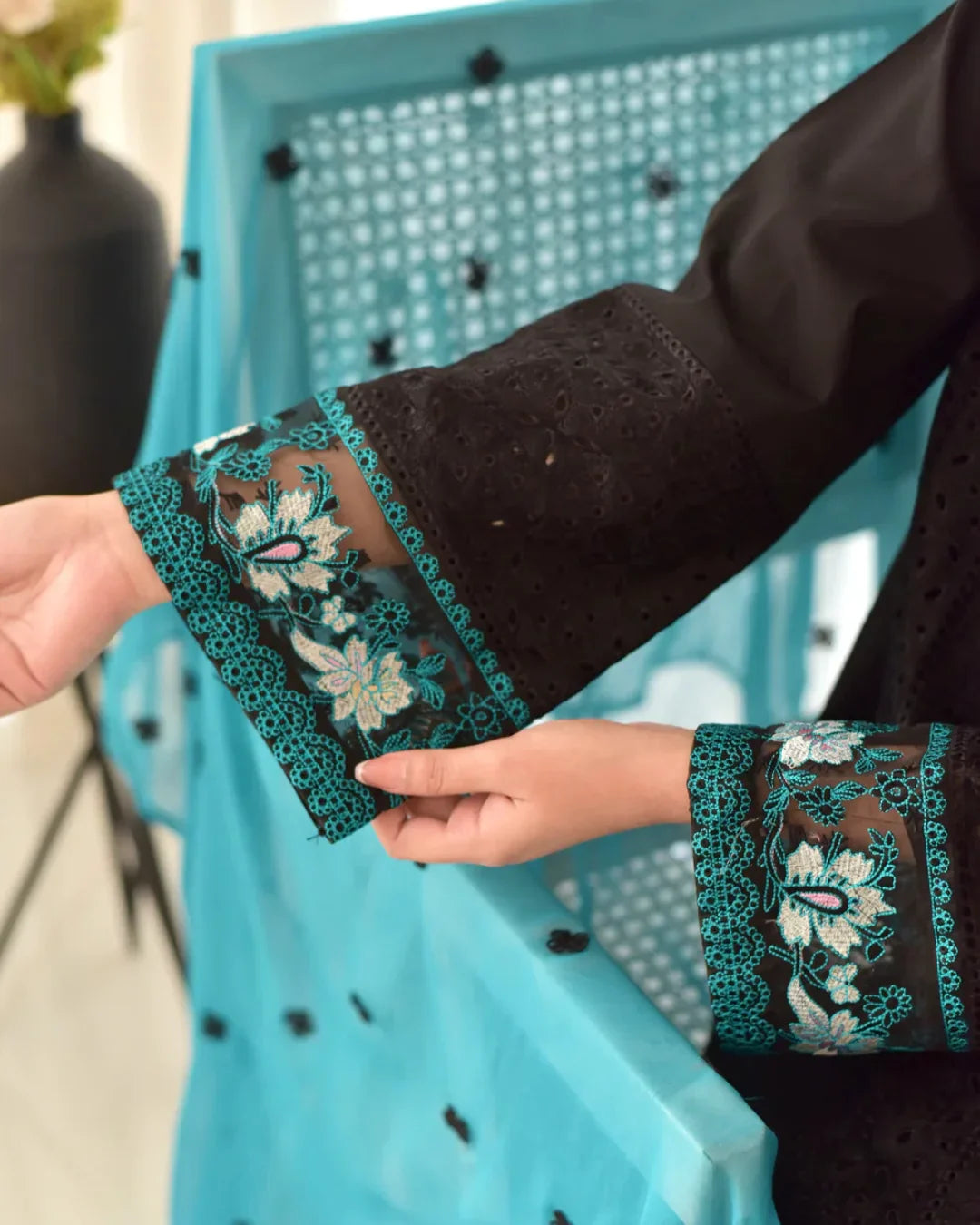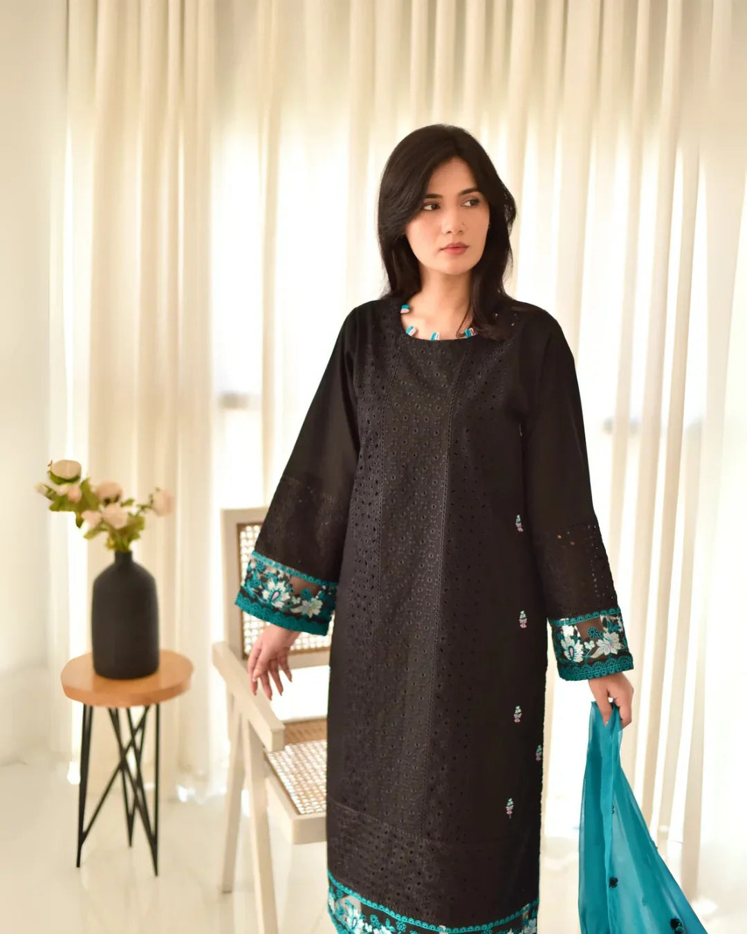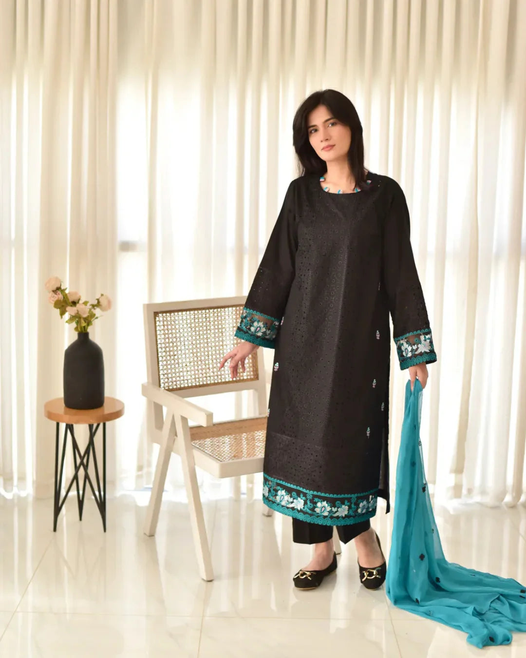 Embrace sophisticated elegance with the Midnight Bloom 3-Piece Dress, a striking ensemble designed for the woman who appreciates bold style and effortless grace. Crafted from premium fabric, this dress features exquisite embroidery and a comfortable, flowing silhouette, perfect for a variety of occasions. The deep black hue brings a touch of dramatic flair to your look, ideal for both evening events and special gatherings. Complete with a beautifully embellished turquoise dupatta, this outfit is sure to enhance your wardrobe with its understated beauty.