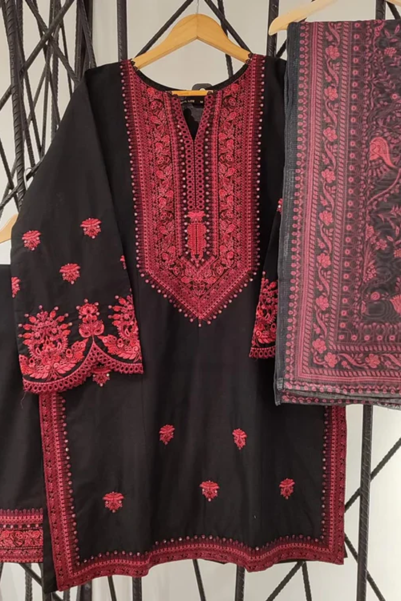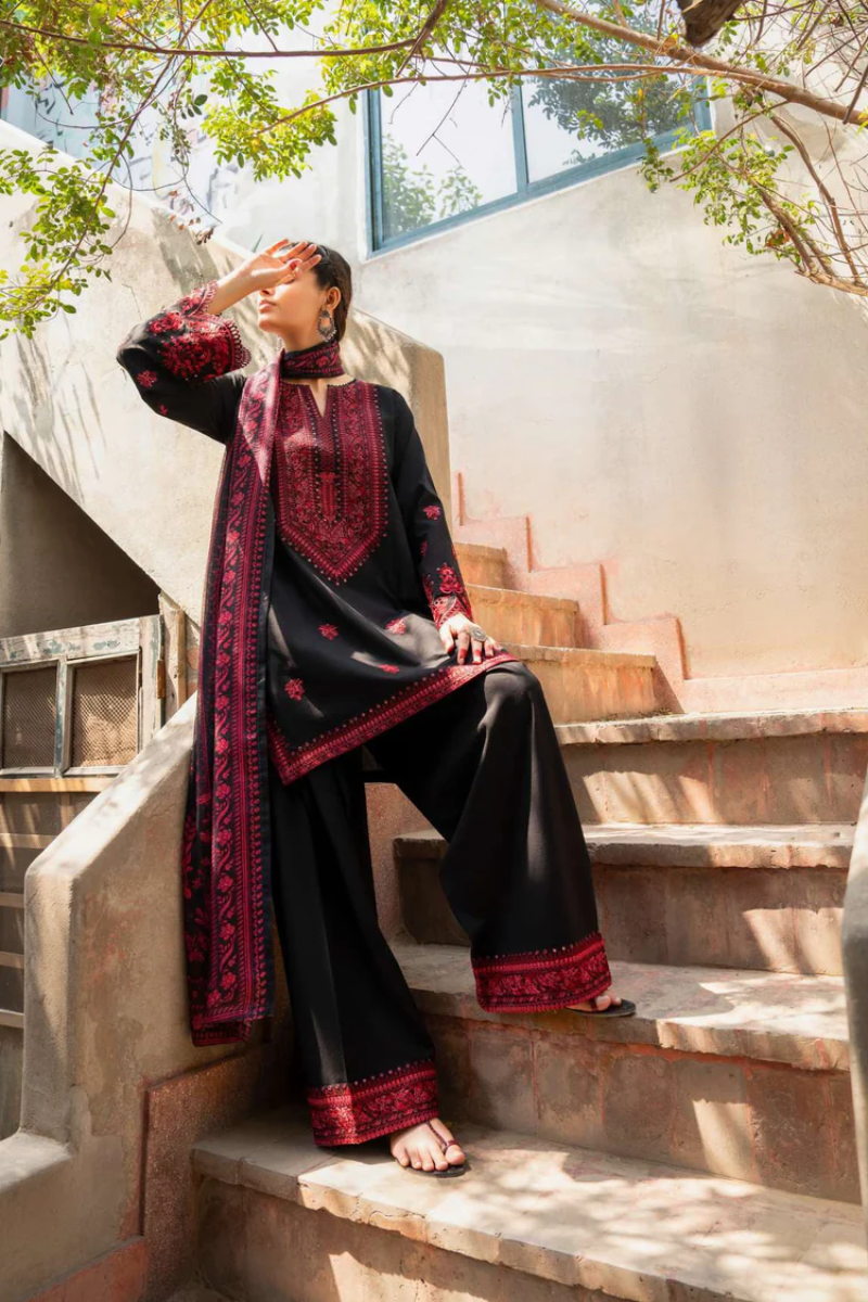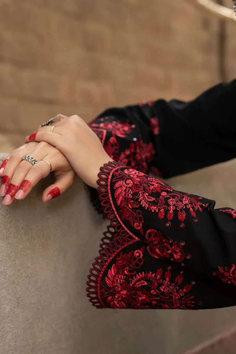 Elevate your festive wardrobe with red scarlet , a timeless 3-piece cotton suit that beautifully blends grace and sophistication. The jet-black canvas is adorned with intricate red embroidery, creating a striking contrast that embodies elegance. Perfect for Eid gatherings or evening soirées, this outfit ensures you stand out with poise and style.